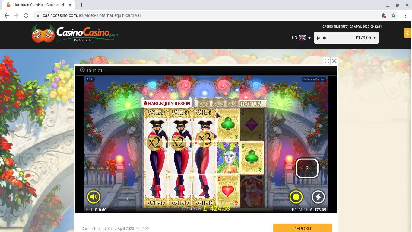 3 Harlequin Wilds dropped in the base game giving a x7 link across 3 reels. Screenshot is the first and by far the biggest hit of the respins.
